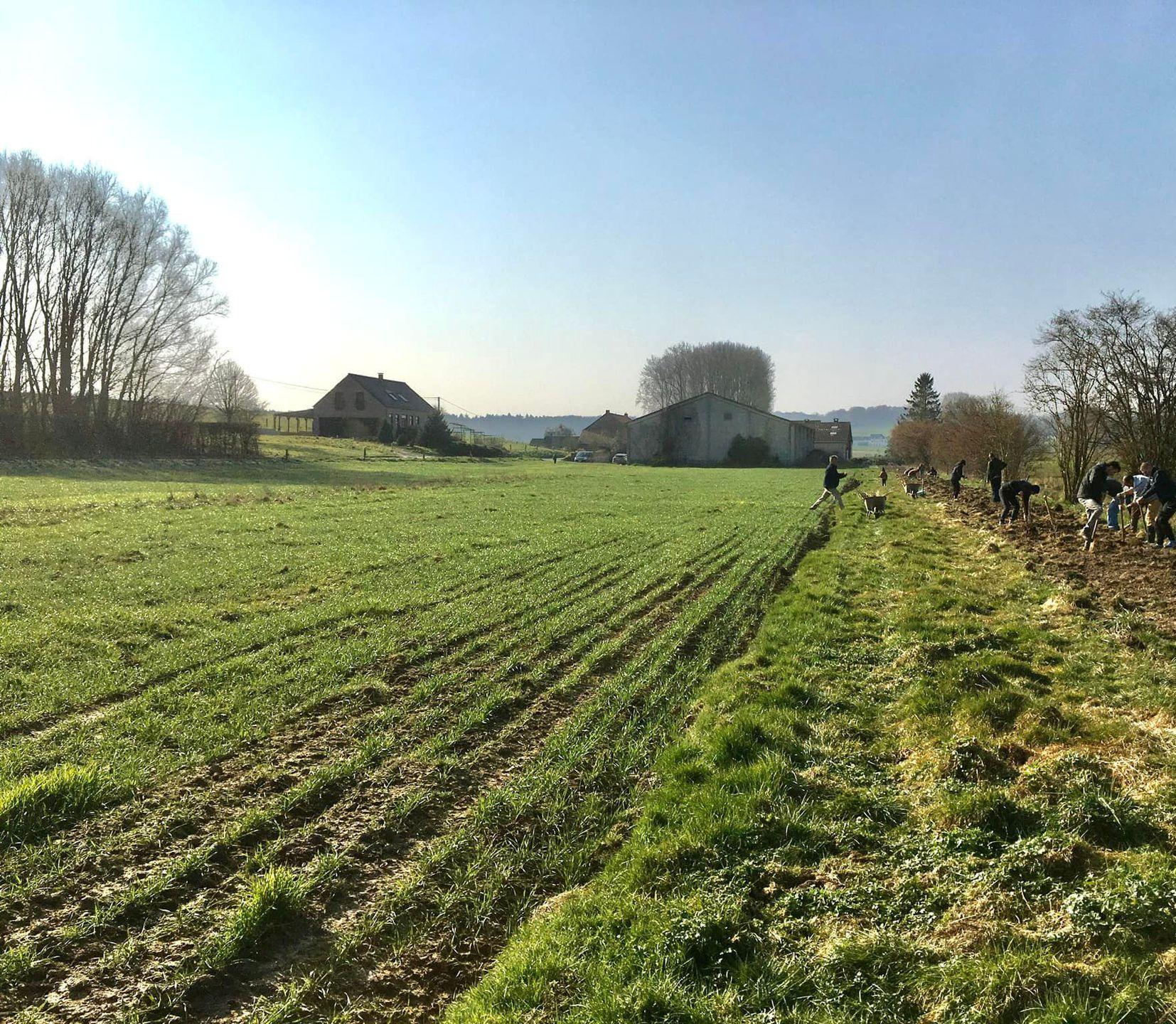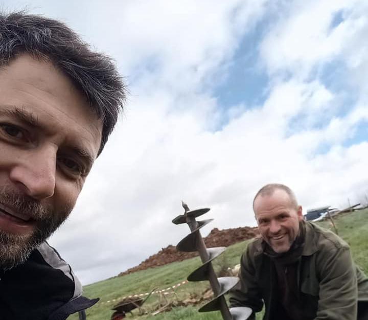 Vincent et Antoine travaillent à la mise sur pieds d'un verger d'arbres hautes-tiges et mi-tiges. Pommes, poires, noisettes, coigns, et cerises seront au rendez-vous.