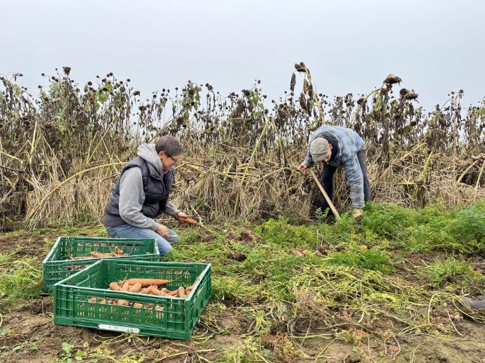 Bert et Chloé sont maraîchers à la ferme. Ils produisent des légumes pour 70 familles en 2025.